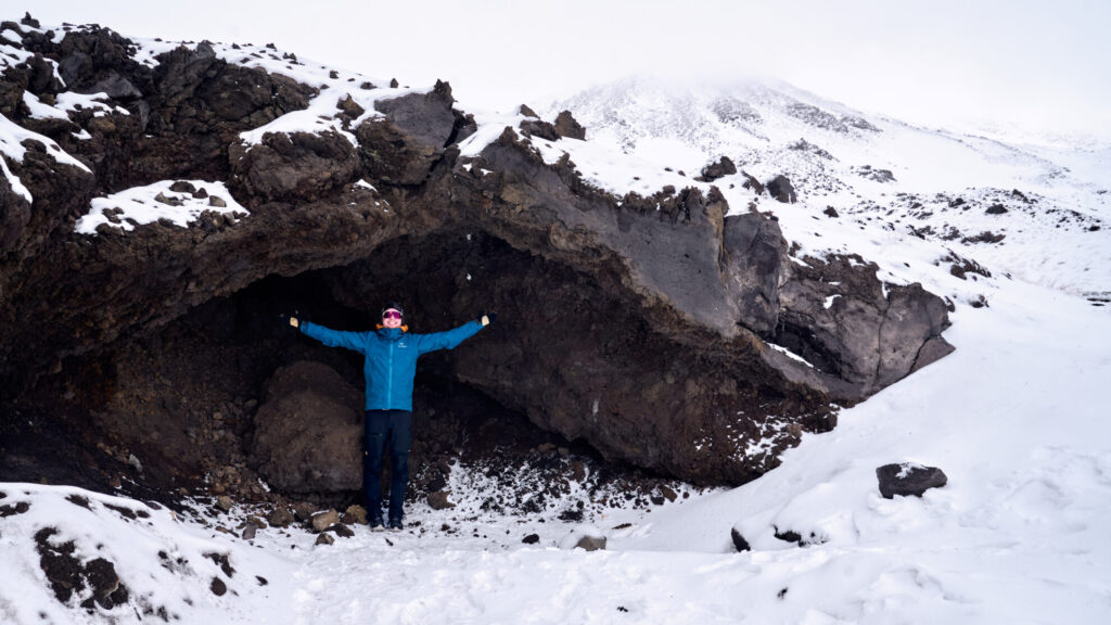 Die Seilbahn geht auf etwa 2000 Höhenmetern los. Im Januar bedeutet das selbst für Sizilien: Schnee. Das Wetter spielt leider so gar nicht mit, und wir werden in der Höhe nicht nur von nassem Schnee sondern auch von einem eiskalten Wind empfangen. Nachdem wir beobachten wie die Seilbahn immer wieder anhalten muss und uns bestätigen lassen das die Sicht am oberen Aussichtspunkt noch schlechter ist, beschließen wir auf das technische Hilfsmittel zu verzichten.